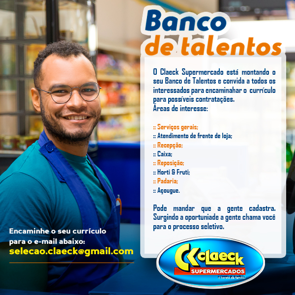 O Claeck Supermercados está montando um novo banco de talentos, se você quiser cadastrar o seu currículo para possíveis vagas futuras. Se ligue na dica abaixo: