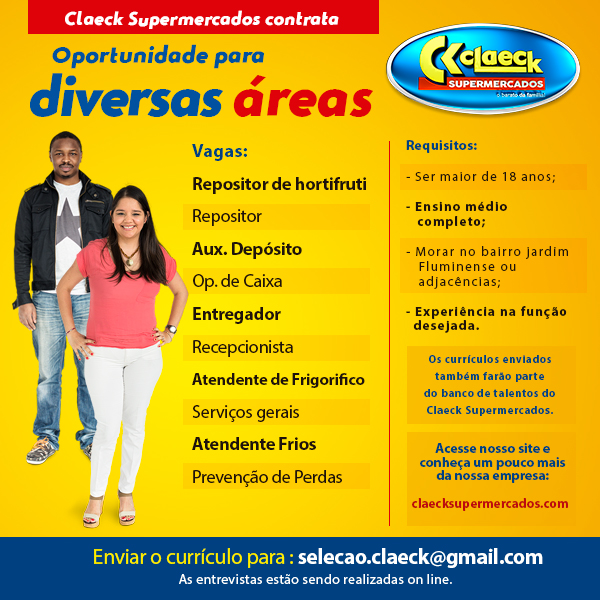 Várias oportunidades de emprego por Claeck SupermercadosPostado em 30 de junho de 2020 Confira as oportunidades e mande seu currículo para o email indicado na peça. Compartilhe isso: Compartilhar no X(abre em nova janela) 18+ Compartilhar no Facebook(abre em nova janela) Facebook Curtir Carregando... Relacionado
