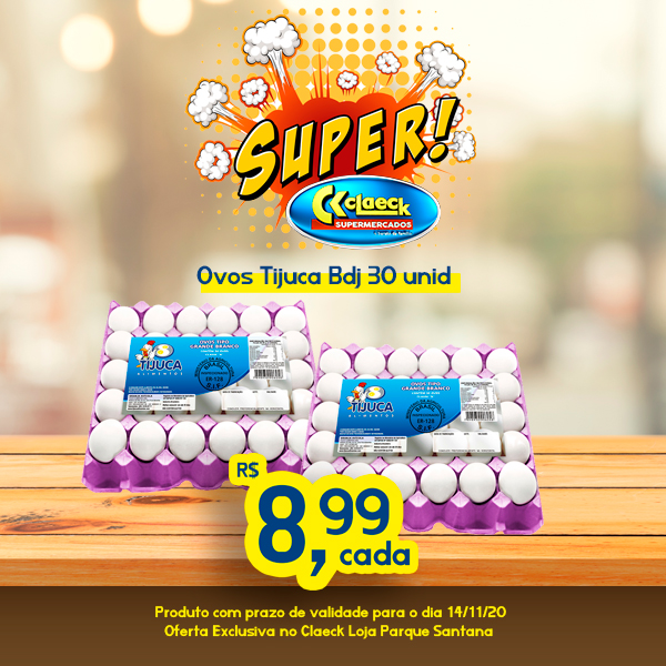 Bandeja de Ovos médios, brancos, Tijuca, com prazo de validade até 14/11/20. Oferta válida só até enquanto durar o estoque. Venha logo aproveitar antes que acabe. Foto ilustrativa e oferta apenas para a loja do Parque Santana.