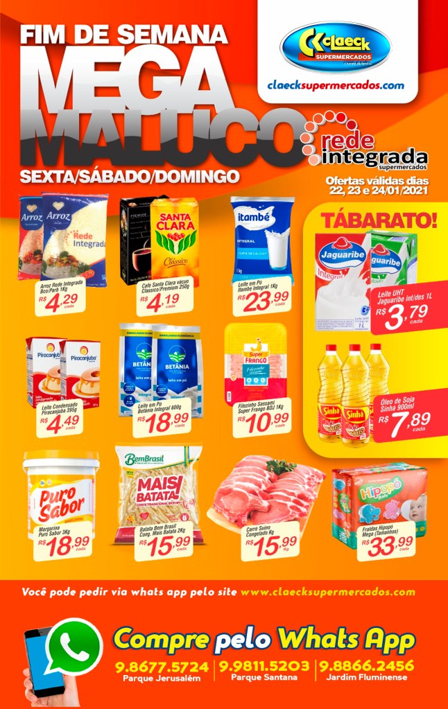 Fim de semana de ofertas! por Claeck SupermercadosPostado em 21 de janeiro de 202122 de janeiro de 2021 Qual loja você prefere fazer suas compras? Claeck Pq Jerusalém Claeck Pq Santana Claeck Jardim Fluminense Compartilhe isso: Compartilhar no X(abre em nova janela) 18+ Compartilhar no Facebook(abre em nova janela) Facebook Curtir Carregando... Relacionado