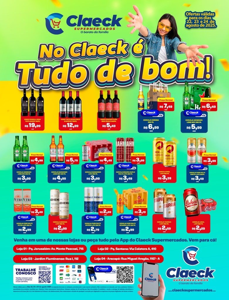 Festa em casa! por Claeck SupermercadosPostado em 23 de agosto de 2025 Escolha a sua loja preferida e peça pelo Whats App e receba em casa*. Loja Pq Jerusalém Loja Pq Santana Loja Jardim Fluminense Loja Aracapé Compartilhe isso: Compartilhar no X(abre em nova janela) 18+ Compartilhar no Facebook(abre em nova janela) Facebook Curtir Carregando... Relacionado