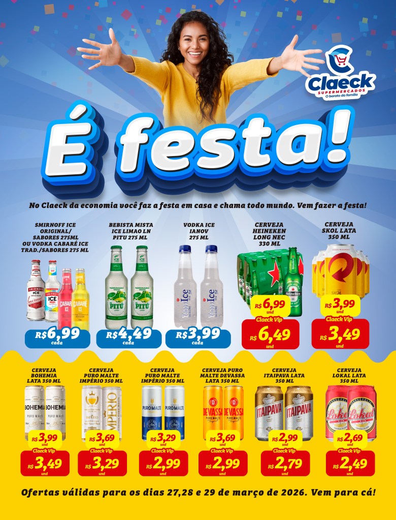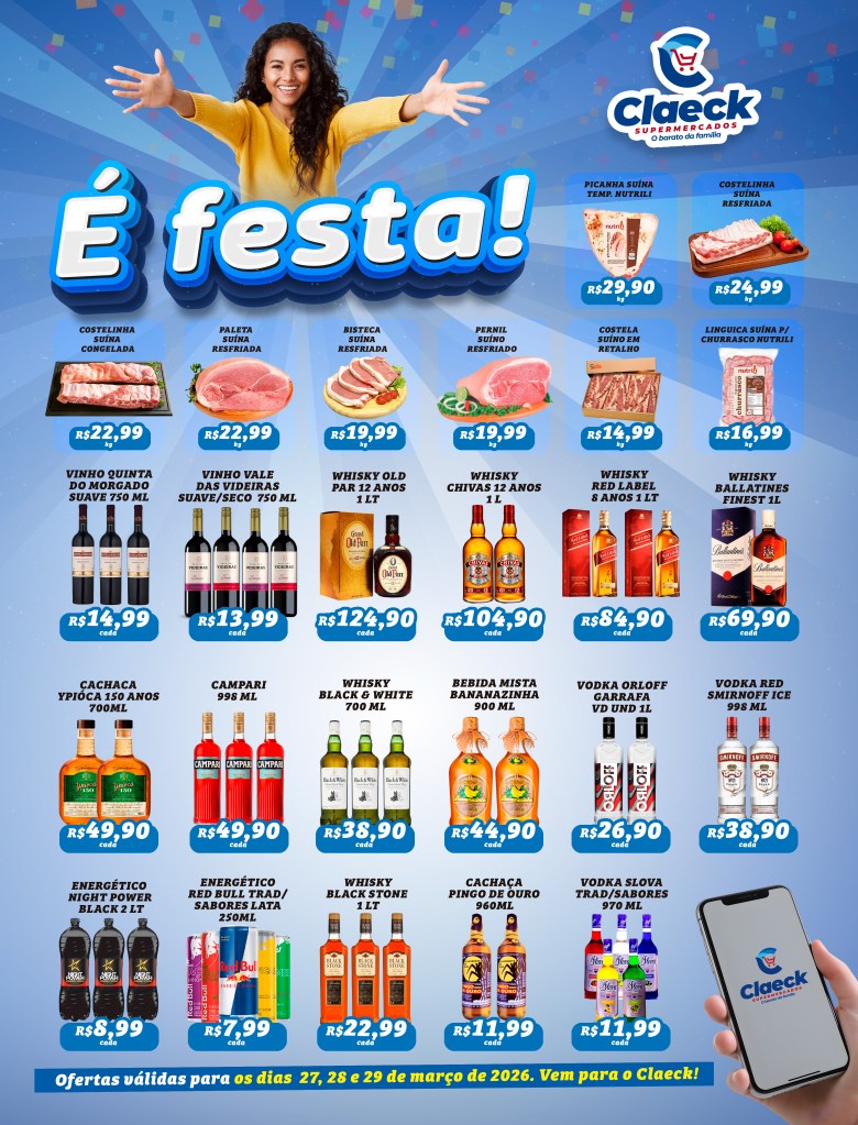 Fim de semana! por Claeck SupermercadosPostado em 26 de março de 2026 Escolha a sua loja preferida e peça pelo Whats App e receba em casa*. Loja Pq Jerusalém Loja Pq Santana Loja Jardim Fluminense Loja Aracapé Compartilhe isso: Compartilhar no X(abre em nova janela) 18+ Compartilhar no Facebook(abre em nova janela) Facebook Curtir Carregando... Relacionado